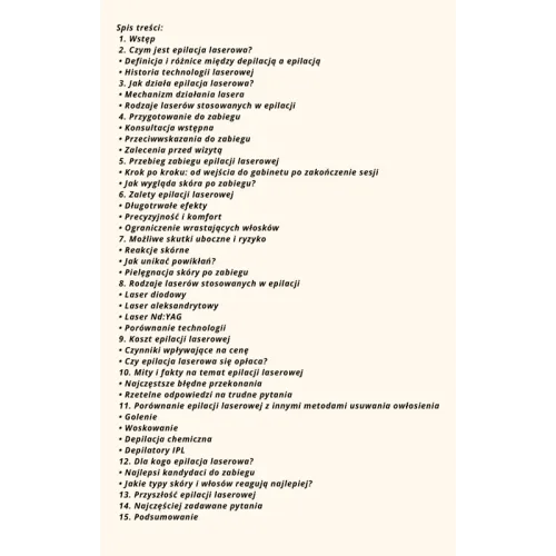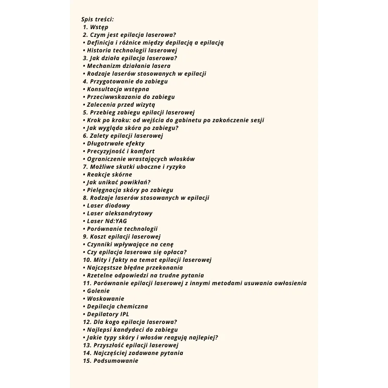 Gładkie ciało i różne metody depilacji zbędnego owłosienia były pożądane już od wieków. Moda na golenie ciała zmienia się w czasie, dziś mamy wręcz kult nieowłosionego ciała dlatego klienci poszukują trwałych metod usuwania niechcianych włosów. Dodatkowym argumentem jest dla nich zlikwidowanie ich wrastania oraz unikanie stanów zapalnych spowodowanych goleniem. W tym e-book'u znajdziesz wiele informacji o tym właśnie zabiegu okiem zabiegowca z 15-letnim doświadczeniem. Zajrzyj na spis treści.