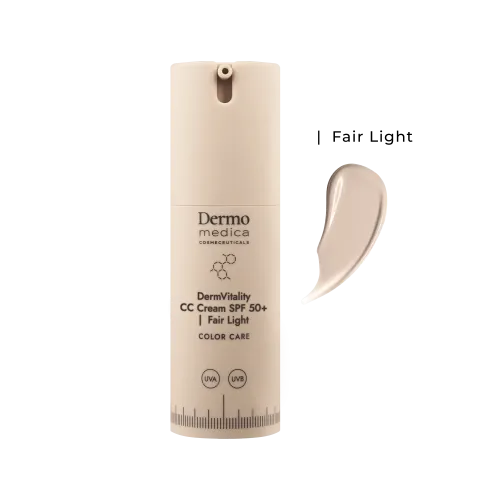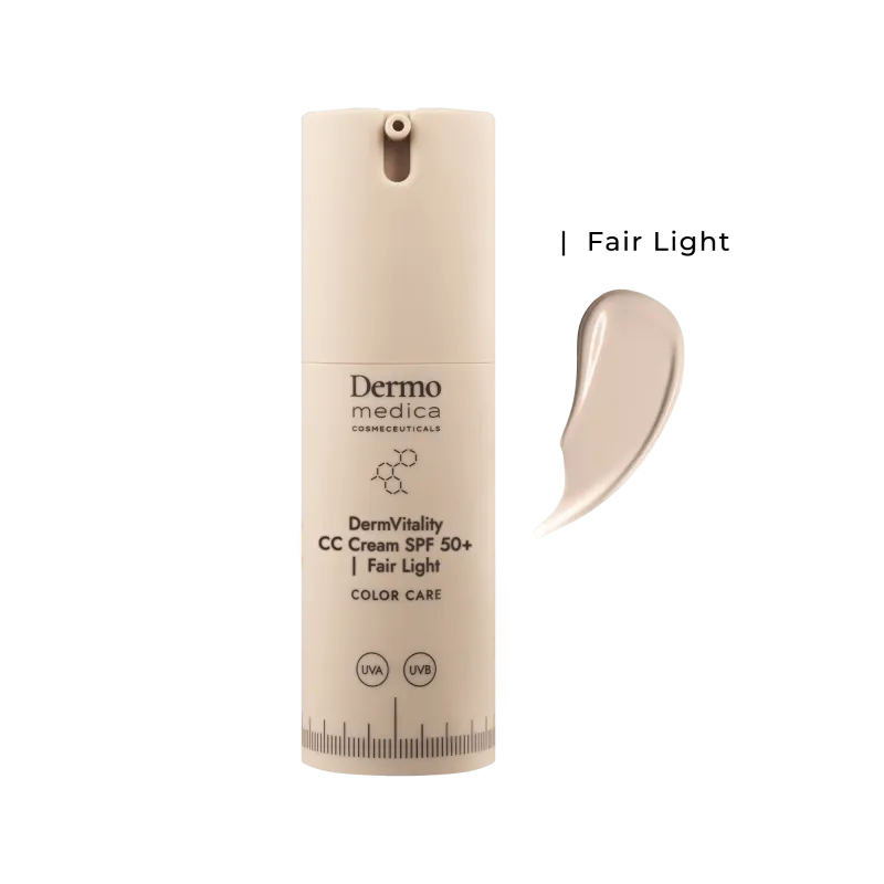 DermVitality CC Cream SPF 50+ to zaawansowany, multifunkcyjny preparat, który łączy w sobie pełną fotoprotekcję, zaawansowaną korekcję kolorytu oraz działanie pielęgnacyjne. Opracowany w oparciu o najnowszą technologię fotoprotekcyjną oraz wzbogacony o składniki nawilżające i regenerujące, w tym witaminę E i glicerynę. Formuła zapewnia nie tylko skuteczne zabezpieczenie przed promieniowaniem UVA/UVB, ale także naturalne krycie niedoskonałości, neutralizację zaczerwienień i ochronę antyoksydacyjną. Dodatkowo działa wygładzająco i odbudowująco, sprawiając, że skóra staje się jednolita, rozświetlona i komfortowa przez cały dzień.